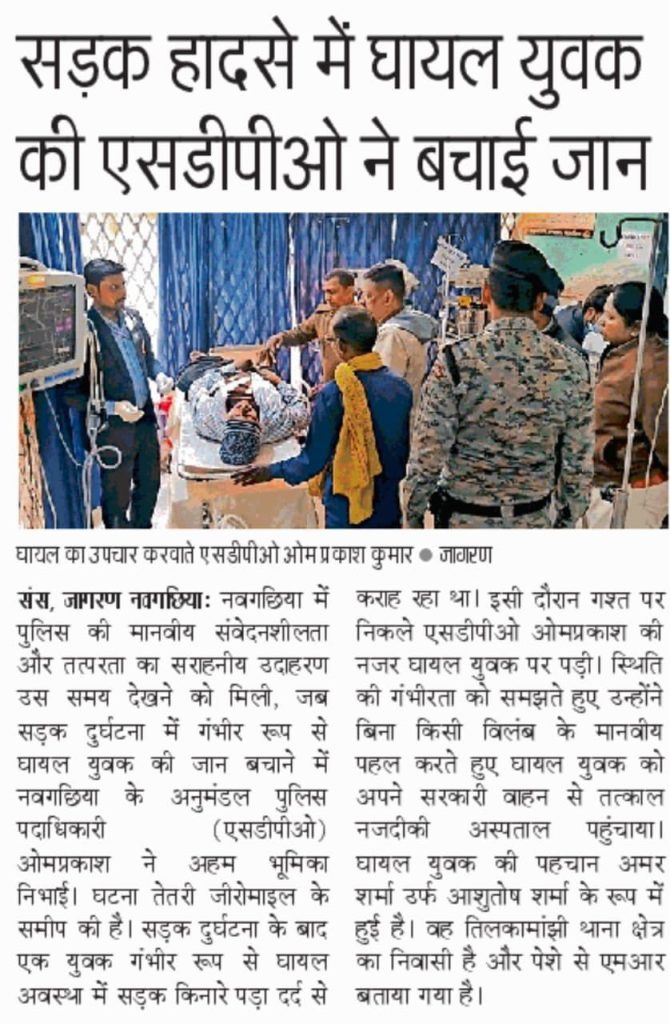 नवगछिया: नवगछिया में पुलिस की मानवीय संवेदनशीलता और तत्परता का सराहनीय उदाहरण उस समय देखने को मिला, जब सड़क दुर्घटना में गंभीर रूप से घायल युवक की जान बचाने में नवगछिया के अनुमंडल पुलिस पदाधिकारी (एसडीपीओ) ओमप्रकाश ने अहम भूमिका निभाई। घटना तेतरी जीरोमाइल के पास की है, जहां एक युवक सड़क दुर्घटना के बाद घायल अवस्था में सड़क किनारे पड़ा हुआ था और दर्द से कराह रहा था। इसी दौरान गश्त पर निकले एसडीपीओ ओमप्रकाश की नजर घायल युवक पर पड़ी। स्थिति की गंभीरता को समझते हुए उन्होंने बिना विलंब किए मानवीय पहल करते हुए घायल को तत्काल अपने वाहन से नजदीकी अस्पताल पहुंचाया। प्राप्त जानकारी के अनुसार घायल युवक की पहचान अमर शर्मा एवं आशुतोष शर्मा के रूप में हुई है, जो तिलकामांझी थाना क्षेत्र का निवासी है और पेशे से मेडिकल एमआर बताया जा रहा है। वह भागलपुर से नवगछिया की ओर जा रहा था। इसी दौरान तेतरी जीरोमाइल के समीप किसी अज्ञात वाहन की चपेट में आने से दुर्घटनाग्रस्त हो गया, जिससे वह घायल हो गया।